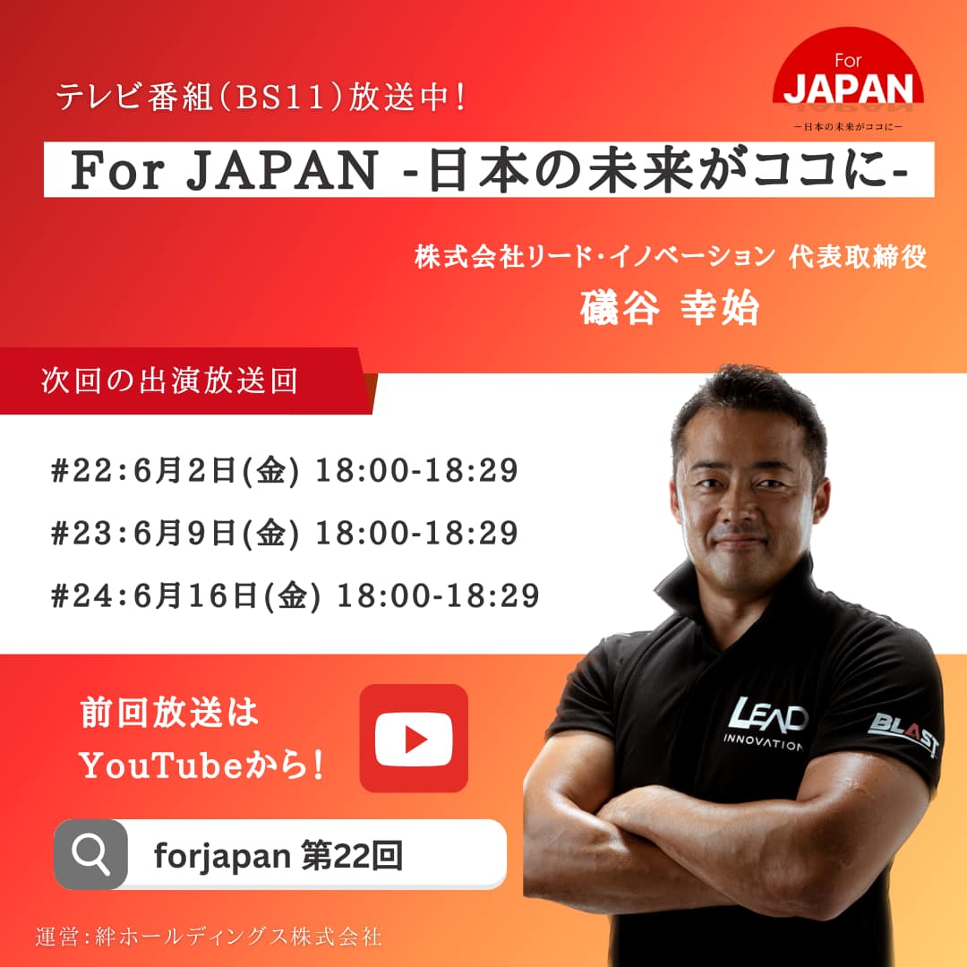 代表礒谷がBS11チャンネル『For JAPAN -日本の未来がココに-』に出演しました。